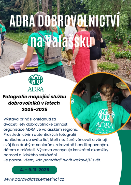 Val. Meziříčí – Dobrovolnické centrum ADRA Valašské Meziříčí slaví letos 20 let. Při této příležitosti pro veřejnost připravujeme v týdnu 3. – 9. listopadu výstavu o dobrovolnictví v zámku Kinských a 4. listopadu pořádáme pod záštitou města Valašské Meziříčí „Dobroden pro Valmez“.