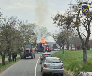Událost se stala u obce Prusinovice na Kroměřížsku. Řidič při zpozorování požáru soupravu odpojil a odjel traktorem do bezpečné vzdálenosti. Hasiči po příjezdu zahájili hasební práce pomocí dvou vysokotlakých proudů vody. Po 25 minutách byl požár lokalizován a po dalších 20 minutách zlikvidován. Seno bylo přemístěno na volné prostranství, kde bylo proléváno vodou. Po celou dobu hasebních prací byla silnice uzavřena. Velitel zásahu předal následně místo majiteli, kterému zůstala k dispozici místní dobrovolná jednotka.