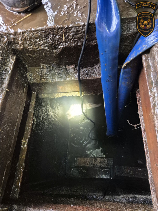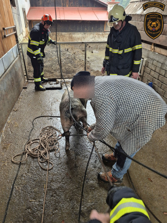 Po poledni hasiči vyjeli do Huslenek na Vsetínsku, kde bylo potřeba zachránit prase, které spadlo do jímky. Pomocí vyprošťovací techniky jej hasiči bezpečně vytáhli a předali majiteli.