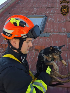 Po vysvobození uvízlého srnce a kočky zachraňovali hasiči ze střechy psa