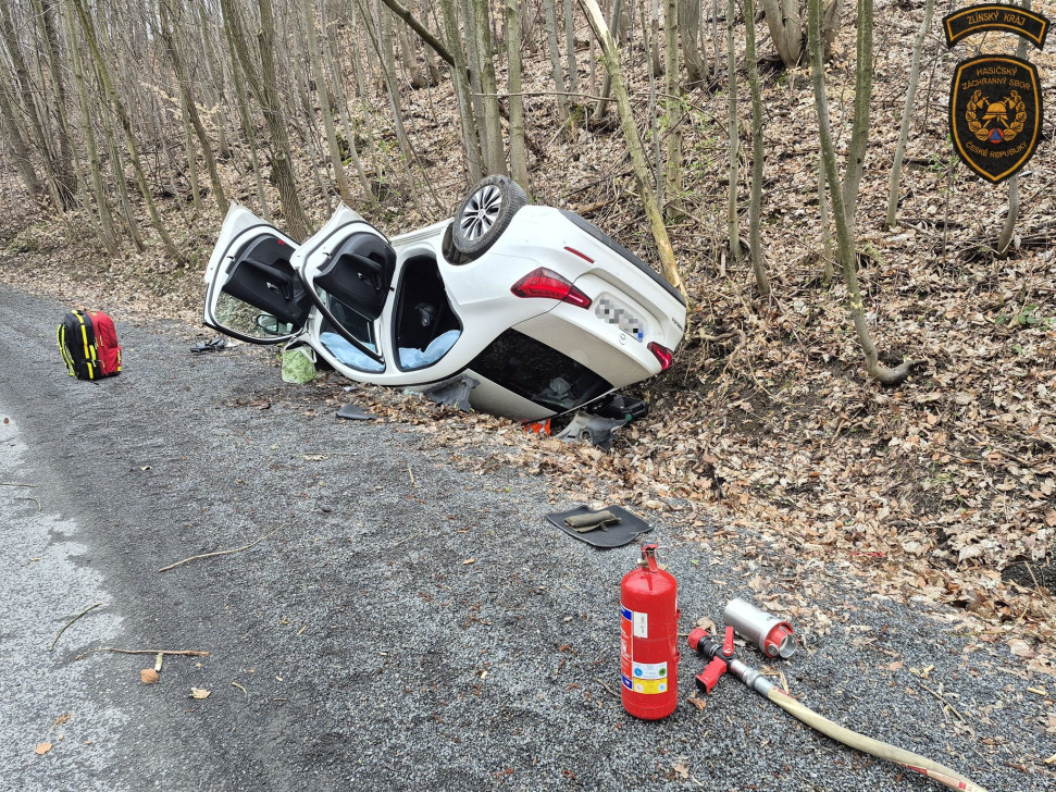 Zlínský kraj – Krátce po půl čtvrté odpoledne v pátek došlo nedaleko obce Chvalčov k dopravní nehodě osobního automobilu, který skončil mimo vozovku na střeše. Ve voze zůstala zaklíněna jedna osoba, a na místo proto okamžitě vyrazily jednotky profesionálních hasičů ze stanic Bystřice pod Hostýnem a Holešov.