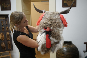 Výstava s názvem Tajemství rumunské lidové masky propojuje dva zdánlivě vzdálené, přesto v mnohém propojené světy moravského Valašska a Rumunska. „Přestože je dělí stovky kilometrů a několik států, jejich obyvatelé si dodnes rozumějí i beze slov. Spojuje je kultura a tradice, které se nerodí podle hranic, ale z rytmu přírody a potřeb místních lidí. Ti po staletí žili v podobných podmínkách pohoří Karpat, čelili drsným zimám a náročnému životu, který se od jara do podzimu točil v koloběhu těžké práce a během zimy potřeby přežít temné období roku. Z těchto podmínek vyrostly prakticky stejné zvyky, různé obřady a další propojení,“ uvedla kurátorka výstavy a historička Muzea regionu Valašsko Ivana Spitzer Ostřanská (na snímku).
