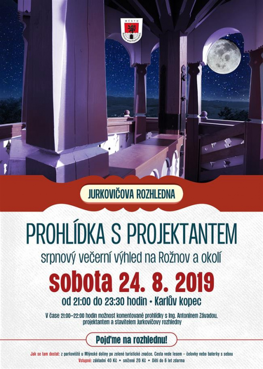 Také tentokrát, v sobotu 24. srpna od 21.00 do 23.30 hodin, je na noční výhledy připraven zajímavý host. „Určitě všechny zveme na naše noční výhledy. Atraktivitu a unikátnost výšlapu a následným nočním výhledům na město dodá komentovaná prohlídka s Ing. Antonínem Závadou, projektantem a stavitelem Jurkovičovy rozhledny,“ uvedl Martin Beníček, vedoucí Oddělení kultury a cestovního ruchu MěÚ Rožnov.