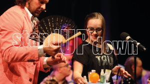 Stand up Down jsou neobyčejné rozhovory o obyčejných věcech za doprovodu kapely v podání Jana Kyncla, Ondřeje Klíče a dalších. Show moderuje, nebo se o to aspoň snaží, Filip Teller. Vydatně mu s jeho nelehkým úkolem pomáhá výjimečná asistentka Martina Trusková alias Voldemort neboli Leonardo, želva Ninja (a jindy zase Karel Gott, Marcus a Martinus nebo Zdeněk Svěrák).