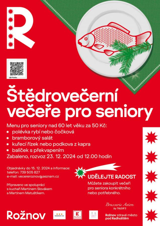 Objednávky na štědrovečerní večeři je možné uskutečnit na telefonním čísle 739 505 827 v pracovní dny od 9 do 15 hodin nebo na e-mailu: vecereroznov@seznam.cz od 20.11.2023 do 18.12.2023. Objednávky budou seniorům na adresu uvedenou v objednávce doručovány v sobotu 23.12.2023 od 12 hodin. Večeři si senioři mohou také vyzvednout v restauraci Brasserie v době od 11 do 13 hodin. Objednávky budou senioři hradit v hotovosti při dodání.